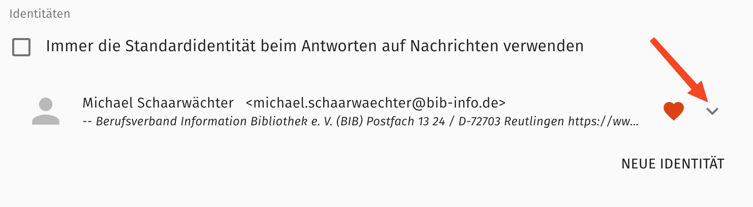 Das ist nicht einfach zu finden, leider. Im Webmailer auf Einstellungen (das Zahnrad oben links) klicken, dann darunter auf "E-Mail". Hier jetzt den Reiter oben namens "IMAP-Konten" auswählen und dort den Stift neben dem einzigen Konto anklicken. Es öffnet sich ein Fenster mit den Einstellungen für den Webmailer, hier bitte nichts ändern außer der Signatur. An die kommt man, wenn man weiter unten im Fenster bei der Identität mit Deinem Namen auf den Pfeil rechts klickt (hier mit einem roten Pfeil markiert):