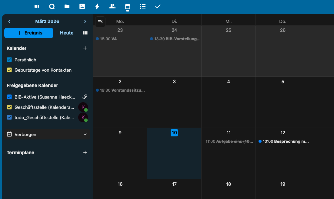 Thunderbird kann zwar eigene Kalender pflegen, die liegen aber auf dem Rechner, auf dem Thunderbird läuft. Ergo: Kein Backup, keine Möglichkeit mit anderen zu teilen. Der BIB hat bereits eine Nextcloud, in Nextcloud gibt es sowohl Kalender als auch Aufgabenlisten. Man kann beliebig viele eigene Kalender erstellen und/oder Kalender und Aufgabenlisten mit anderen teilen.