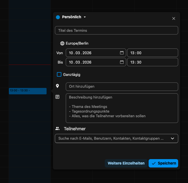 Als erstes stellt man den richtigen Kalender ein, dazu oben auf das Dreieck neben "Persönlich" klicken. Hier kann man alle Kalender auswählen, die einem zur Verfügung stehen, also auch die ausblendeten (hier "Testkalender"). Der Rest sollte selbsterklärend sein. Die Teilnehmer sind entweder komplette Mailadressen oder, wenn diese Menschen einen Account in der Nextcloud haben, deren Accountnamen.