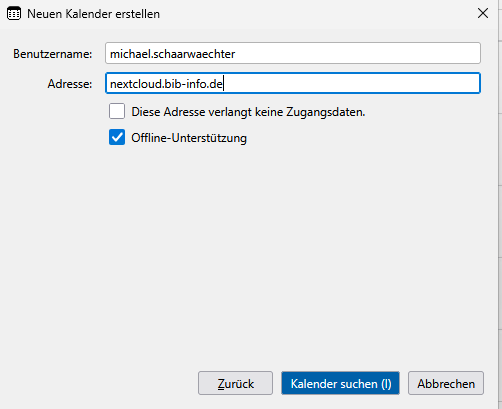 Jetzt klickt man auf "Neuer Kalender" ganz unten. Im nächsten Dialog "Im Netzwerk" auswählen. In das folgende Fenster gehört der Nextcloud-Account (üblicherweise vorname.nachname) und die Adresse der Nextcloud: nextcloud.bib-info.de