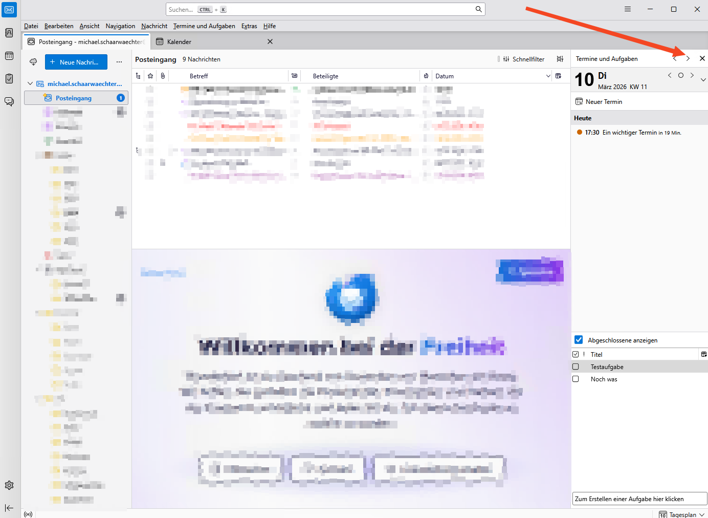 Hier sollte man die gemeinsame Ansicht von Terminen und Aufgaben einschalten, indem man in der rechten Spalte oben auf den markierten Pfeil klickt, bis dort "Termine und Aufgaben" steht wie im Screenshot zu sehen.