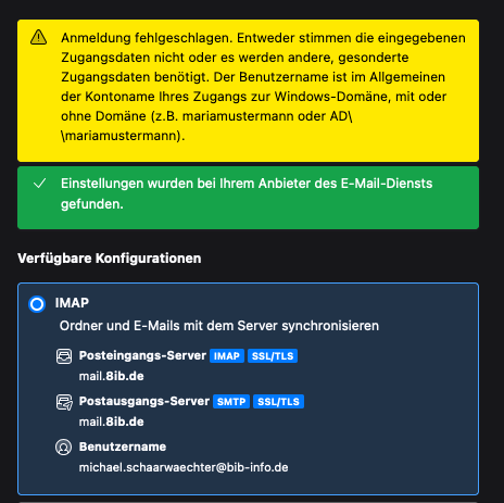Zumindest bei mir gab es beim Neuanlegen in Thunderbird eine Warnung (siehe Screenshot). Direkt darunter stand aber, dass alles geklappt hat und so war es dann auch. Nicht verwirren lassen.