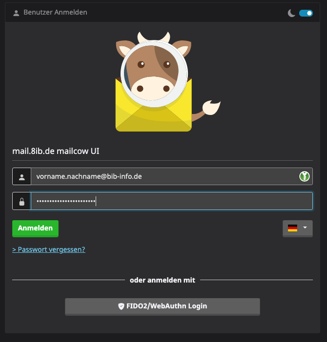Es ist empfohlen, beim ersten Anmelden das Passwort zu ändern, da das initiale Passwort per Mail verschickt worden ist.