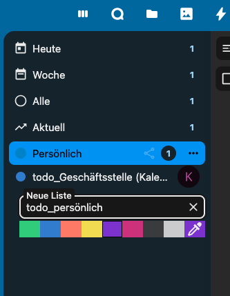 Es empfiehlt sich, Aufgaben immer ein Beginndatum zu geben. Man kann das natürlich verschieben, wenn die Aufgabe überfällig ist, aber nur so kann man seine Aufgaben zeitlich sortieren. Wenn man die Aufgaben intensiv nutzt, ist es auch sinnvoll, einen eigenen Aufgabenkalender dafür anzulegen, da ansonsten alle Aufgaben im eigenen Standardkalender "Persönlich" gespeichert werden. Dazu klickt man auf "Neue Liste" links, vergibt einen Namen (der Übersichtlichkeit halber sollte er mit todo_ beginnen) und klickt auf eine nette Farbe. Enter speichert.