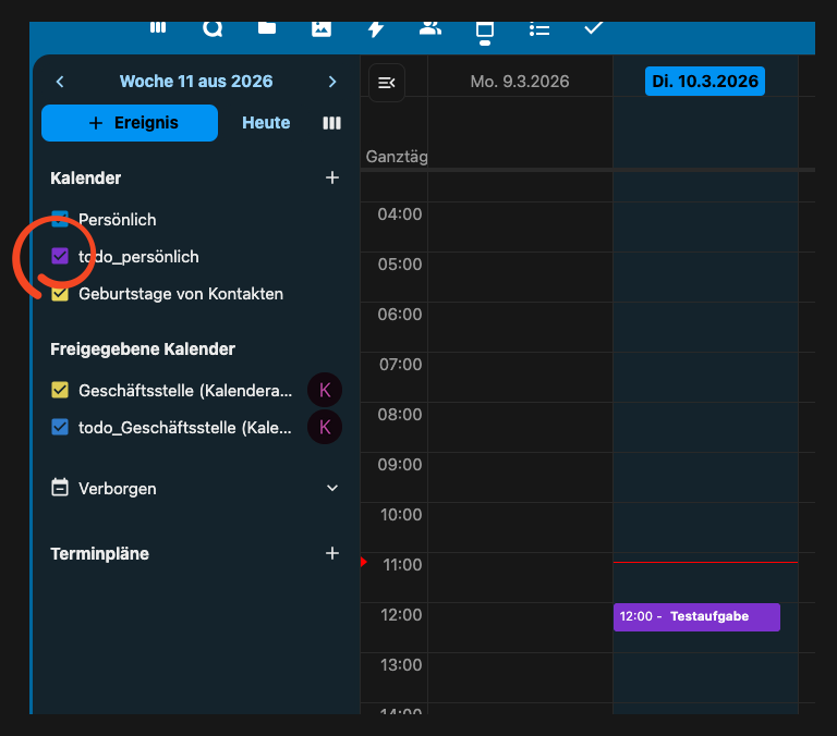 Im Kalender kann man nun seine Aufgaben ein- oder ausblenden mit dem Haken: