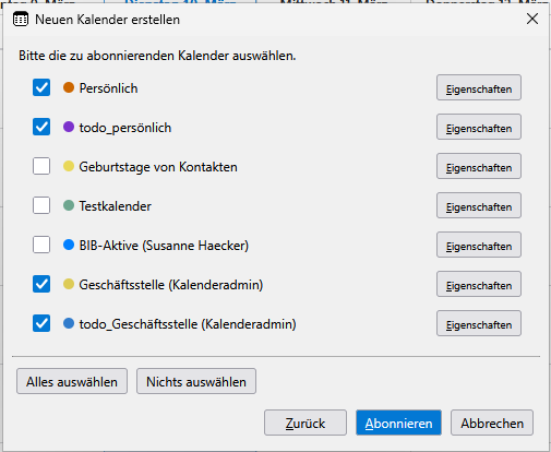 Es erscheint ein Fenster mit den verfügbaren Kalendern und Aufgabenlisten. Hier bitte die richtigen auswählen. Die "Geburtstage von Kontakten" sind nur dann sinnvoll, wenn man auch die Kontakteverwaltung von Nextcloud verwendet.